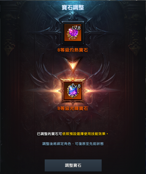 調整為光輝寶石可透過[寶石專家]NPC,花費藍水晶或等待15天變更回原寶石。
