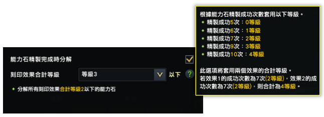 於特利希溫修練場的「角色設定」設定能力石效果後,「刻印設定」鍵左側將依能力石精製等級顯示獎勵效果。